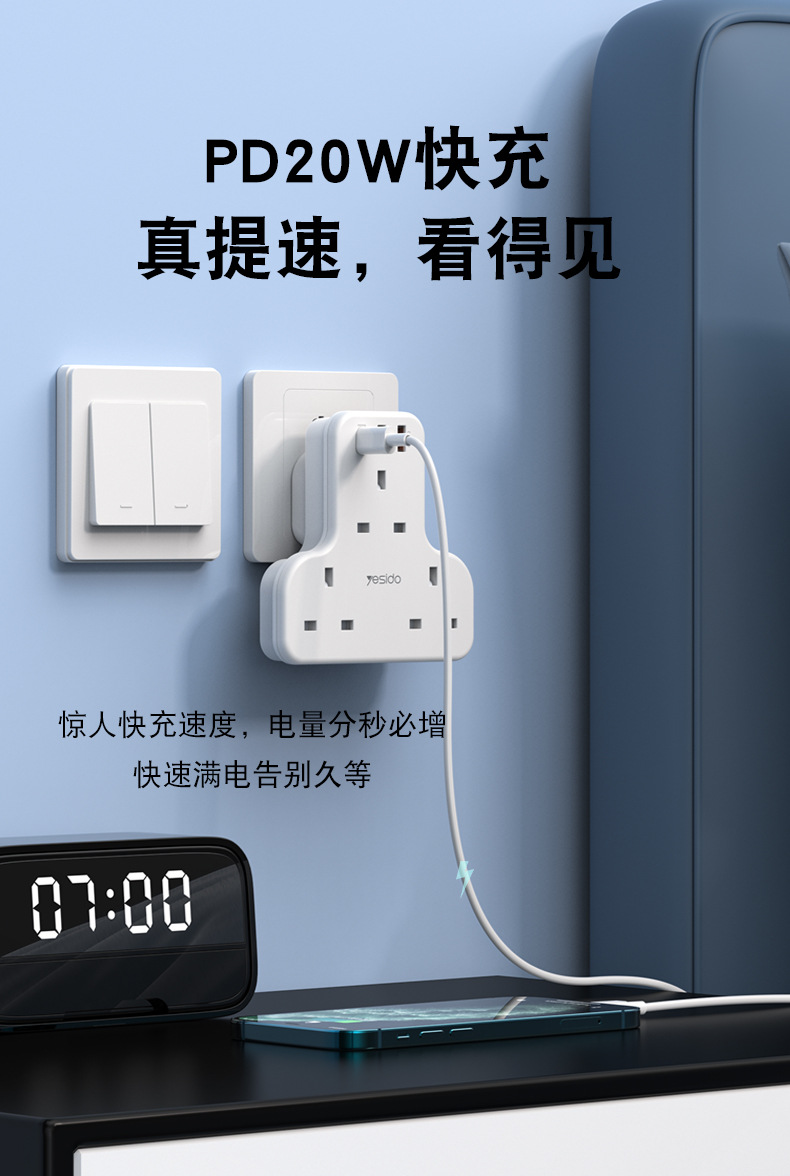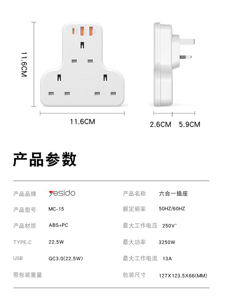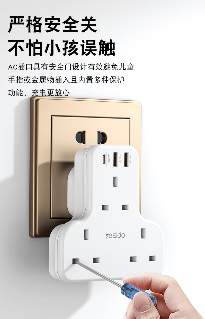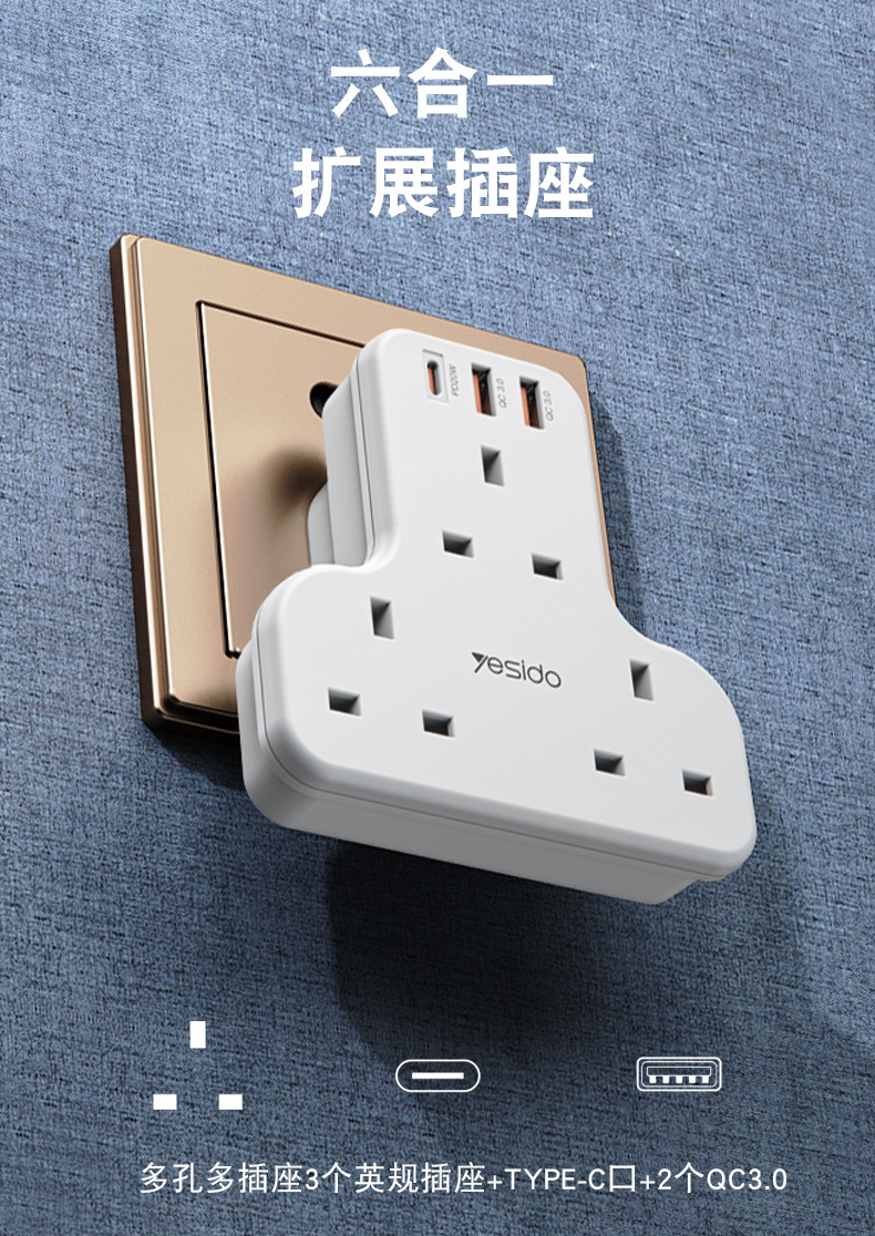 3250W排插,英規,拖3個英規加1個TC快充(20W)2個QC3.0快充,